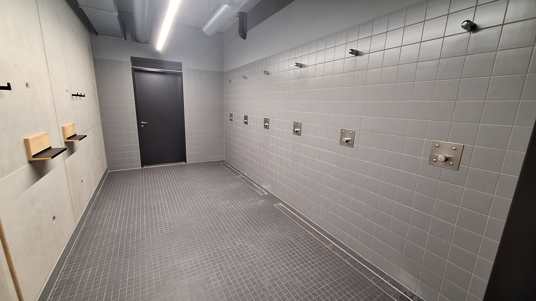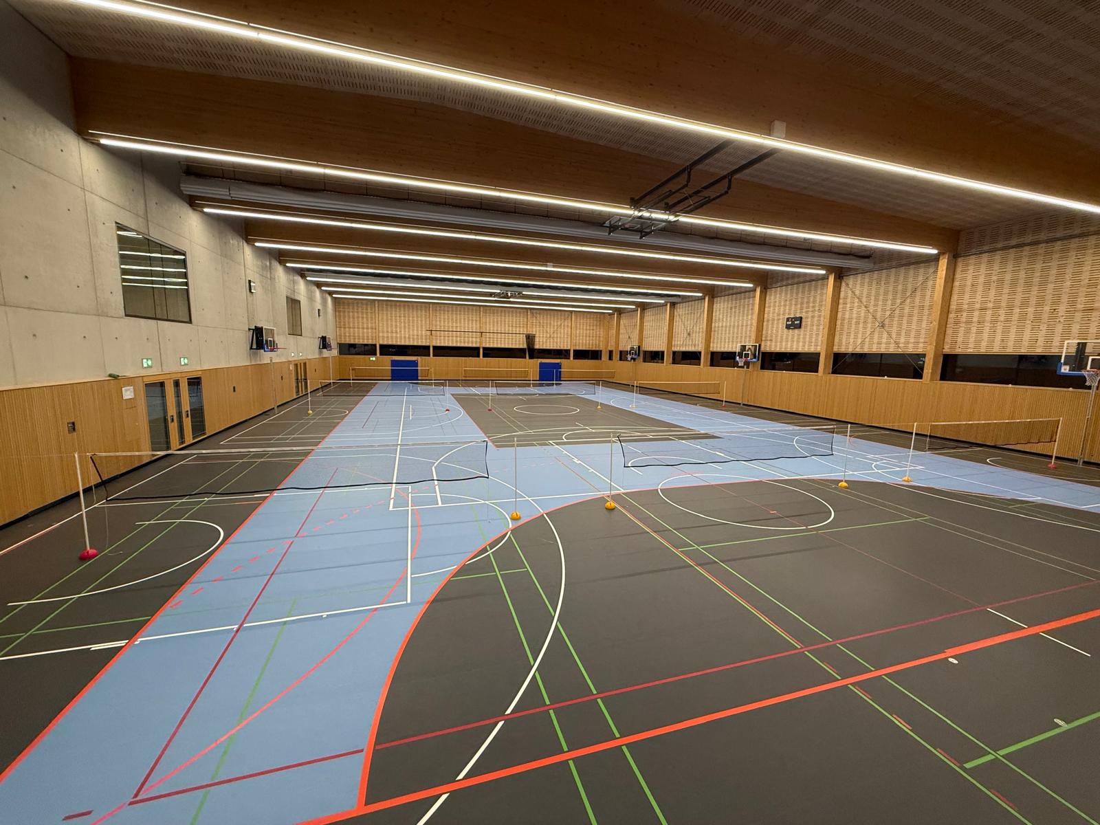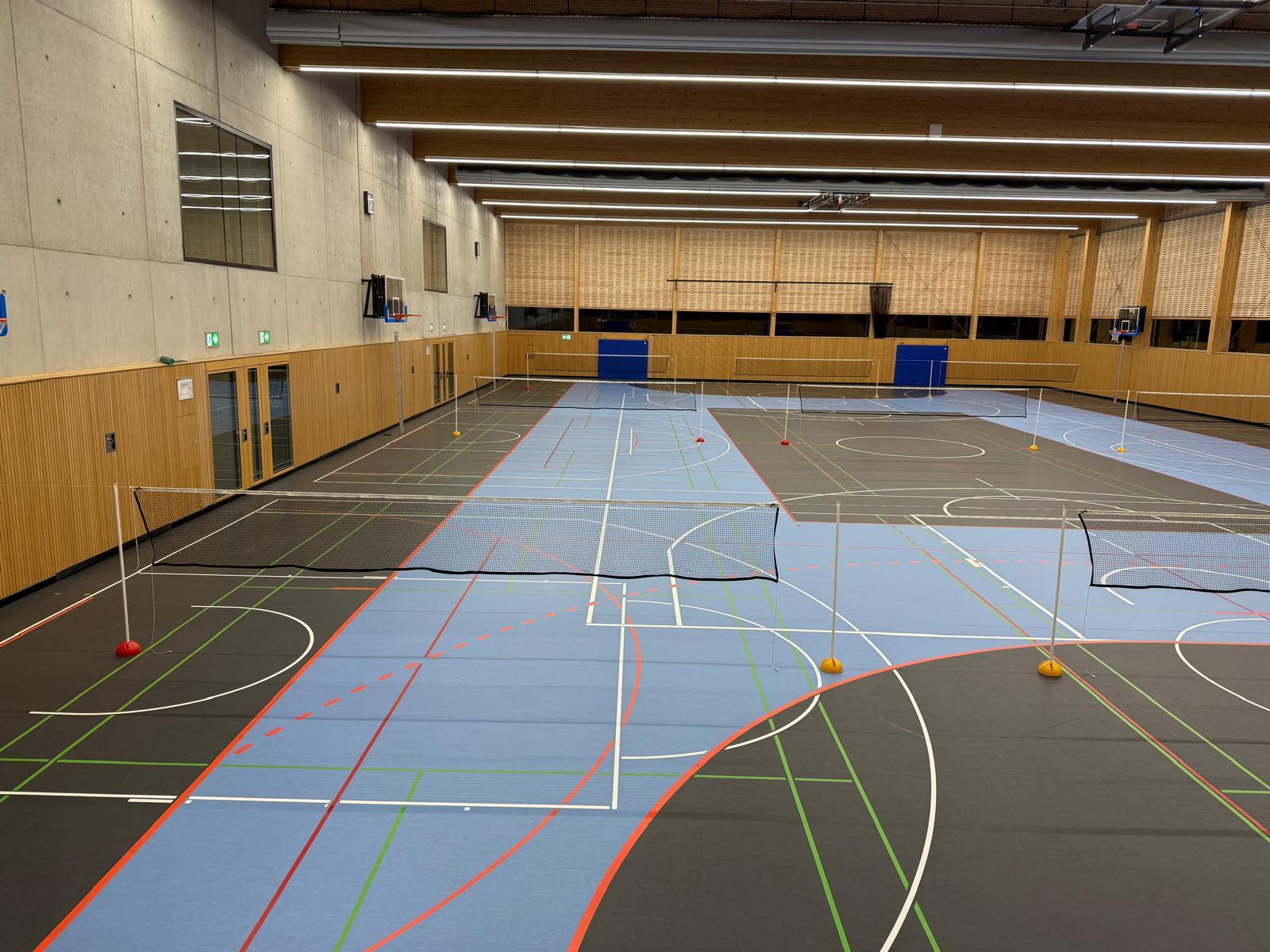 Bei der Trainingshalle handelt es sich um eine dreifach-Turnhalle mit insgesamt 9 Badminton Feldern. Mit einer lichte Höhe von 7,5 Metern ist diese ausreichend hoch. Der Eingang zur Sporthalle und den Umkleiden inkl. Duschen befindet sich unterhalb der Treppe.
